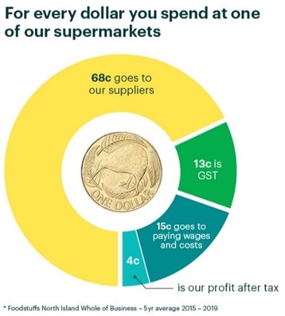 For every dollar spent at our supermarkets, we are responsible for 19c which covers our wages and costs and provides our post-tax profit. The largest component of shelf prices is the price we pay suppliers for goods (68c in $1).