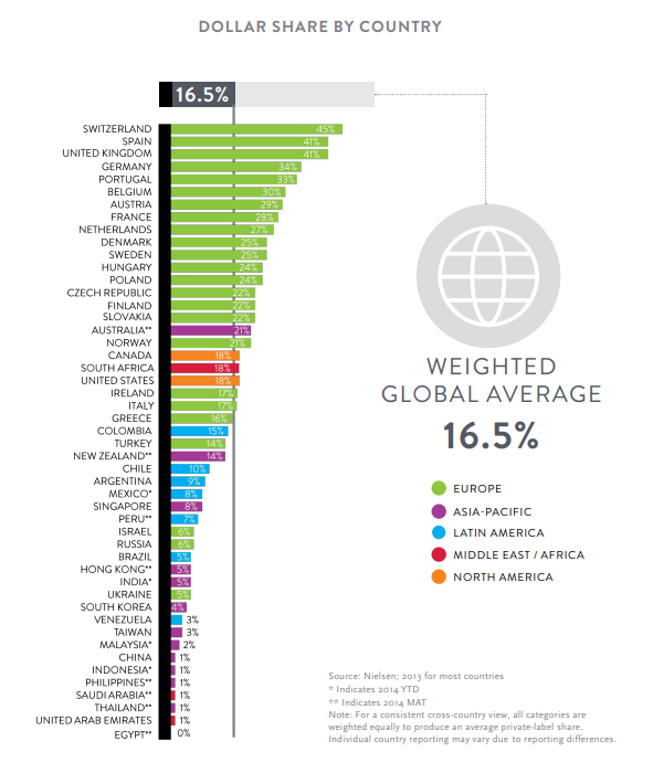 Sources: Foodstuffs North Island internal data, Nielsen IQ, state-of-private-label-around-the-world-nov-2014.pdf (nielsen.com).