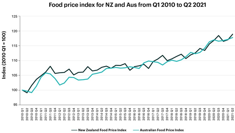 Our grocery price inflation is also consistent with Australia. Australia has a larger number of grocery retailers than New Zealand and Aldi, one of the smaller retailers, has nearly doubled in size between 2011 and 2021. Despite that, the price of food has increased in Australia at a very similar rate to that in New Zealand. The figure below shows both rates of food price inflation.